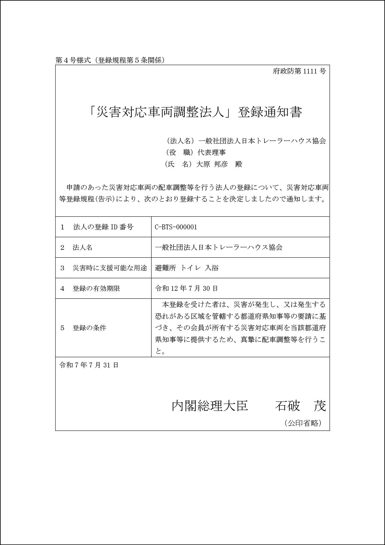 内閣府の「災害対応車両登録制度」の調整団体に登録されました